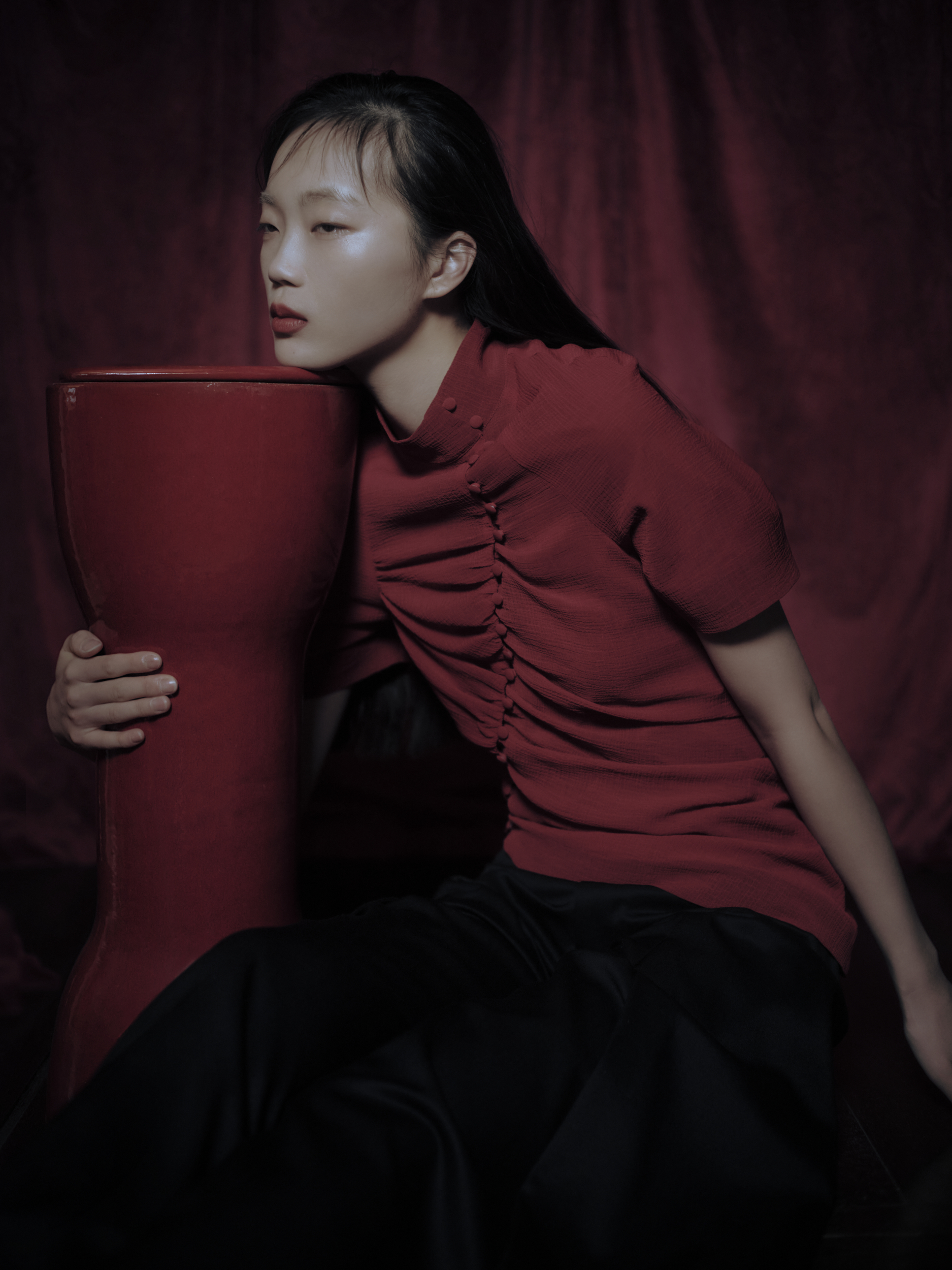 Red serves as the point of departure.Fine-gauge knit tank tops adorned with large-scale floral motifs that feel neither wholly Eastern nor Western.Polo shirts distinguished by Chinese frog-button openings.Radically shortened layered pieces.